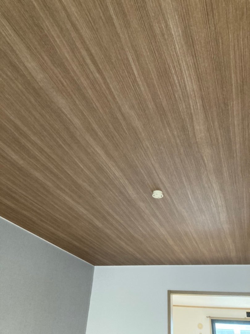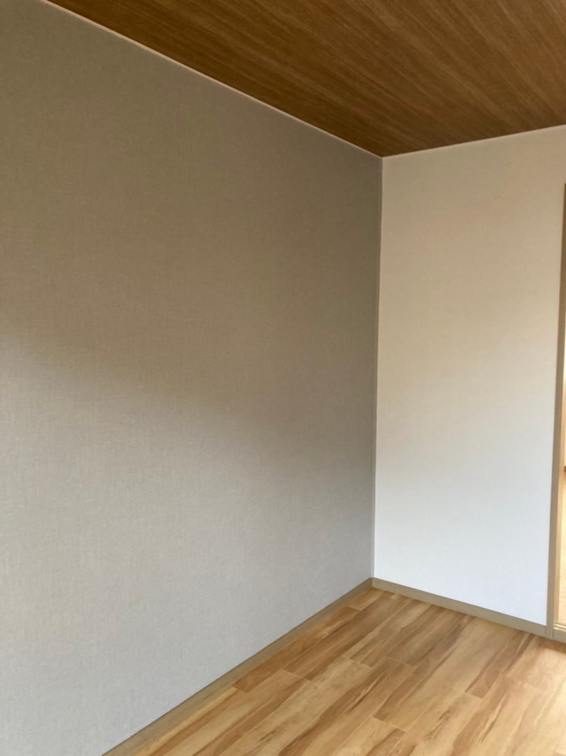 天井は木目、壁の一面はグレーのクロスを施工。