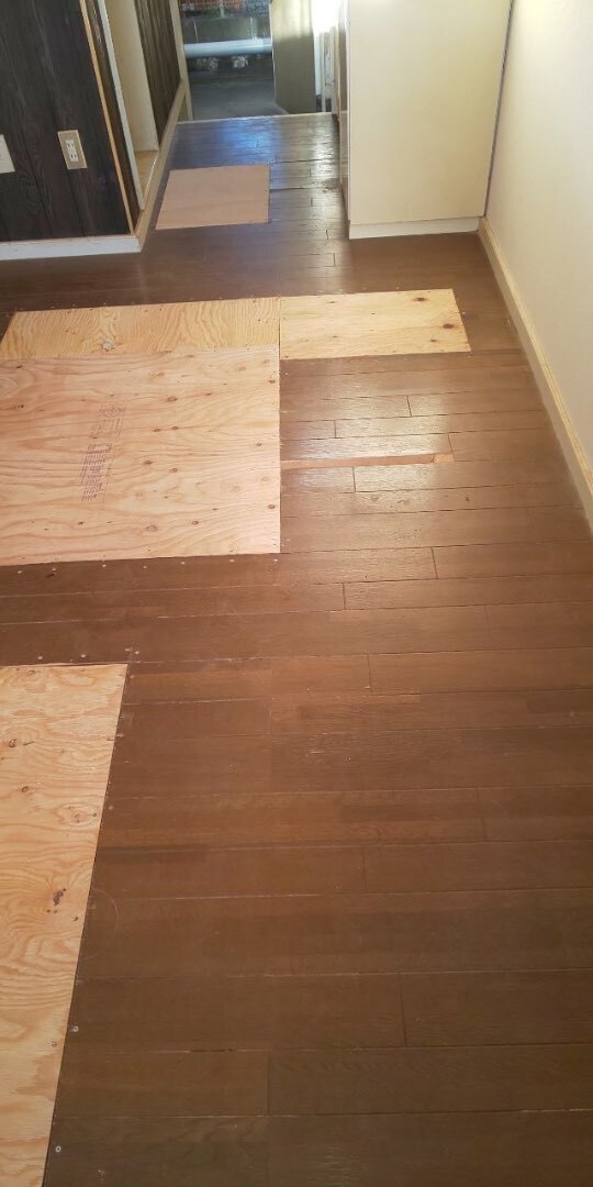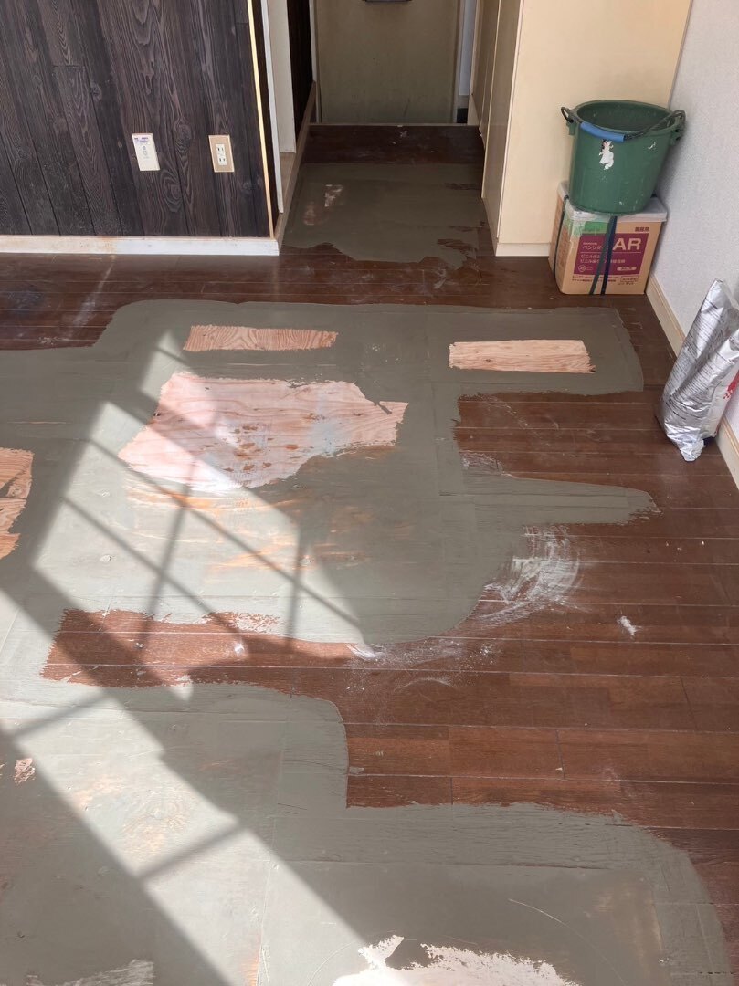 歩くとベコベコと沈んでしまう箇所がかなりあり大工工事で部分補強張り替えしてからフロアタイルを施工しました。